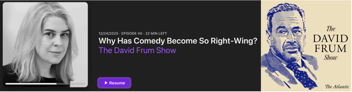 If you’re looking for a potential answer, listen to the December 24th conversation on The David Frum Show, a podcast produced by The Atlantic. Frum hosts fellow staff writer Helen Lewis on the episode, titled “Why Has Comedy Become So Right-Wing?” Their diagnosis of comedy’s supposed political bias offers a telling insight into the decline of establishment journalism and the rise of independent comedy podcasters like Joe Rogan and Theo Von.